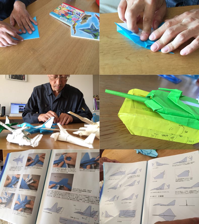 小南さんの作品は、切ったりつけ加えたりしないすべて1枚の折り紙から作られます。(10式戦車は、砲塔と車両2枚で制作)
