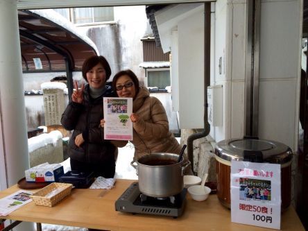 青大豆カレー試食コーナー、ダブル女将の図(笑)