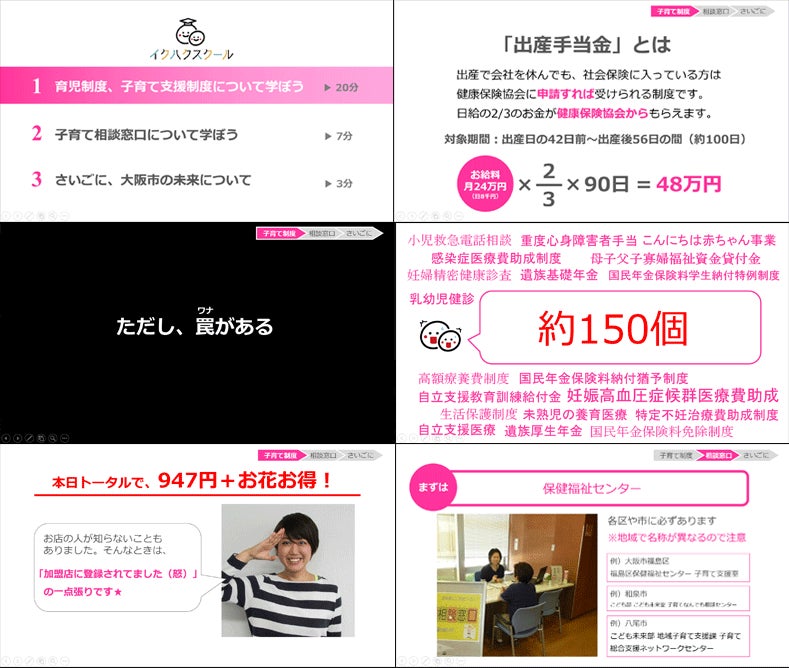 これが「分かりやすい」「知らなかった!」「もっと早く知ってれば・・」と大変好評をいただきました。今でも、制度や窓口をスライドを使って直接親に教える「イクハクスクール(大阪市版)」を自費で毎月開催しています。
