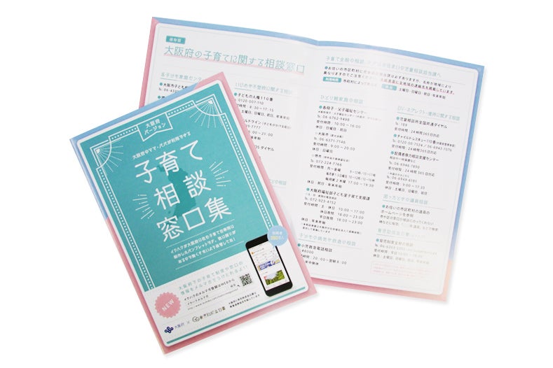 ▲スクールでは、大阪府のママ・パパが相談できる窓口を全て掲載したA5見開きの「子育て相談窓口集」を株式会社オズ・ワーク様の提供でプレゼントしています。