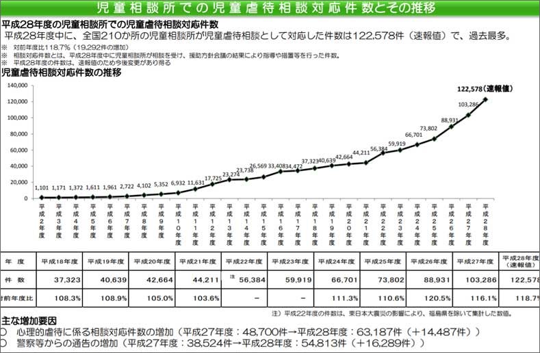 ▲厚労省:平成28年度 児童相談所での児童虐待相談対応件数<速報値> より