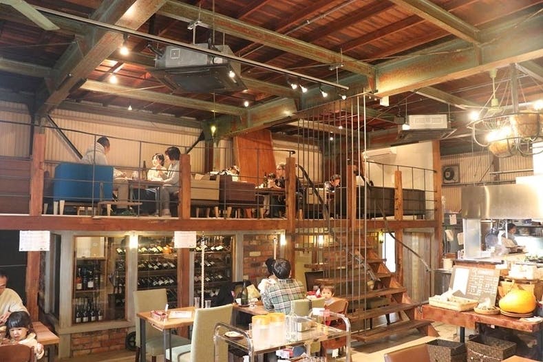 (店内写真:オープンキッチン、ワインセラー、2階ソファ席、1階テーブル席など)