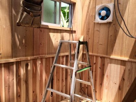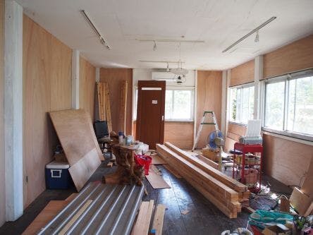 コミュニティスペース部分ベニヤを貼り終え、漆喰ぬるか・・・塗装するか・・・色々悩みましたが、今回も、壁紙を張っていくことにしました