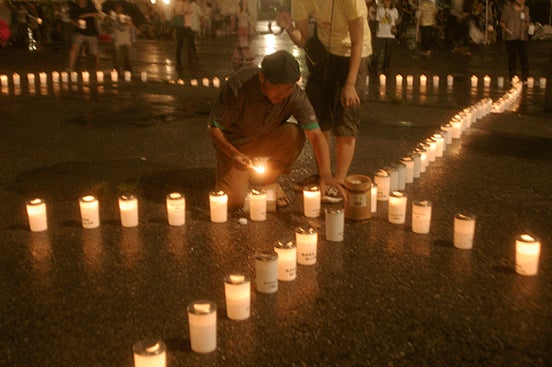 平和を願って原宿の表参道で花を配ってパレードをしたり、広島の原爆の残り火で30メートルのピースマークをつくったりしました。