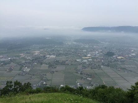 眼下には先ほどまで歩いていた田園風景やふもとの豊後森駅周辺が見える絶景!