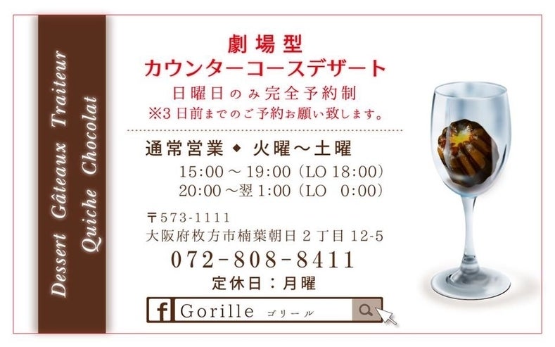 2017年、枚方市楠葉に移転。カウンターデザートの専門店『Gorille』をオープン。