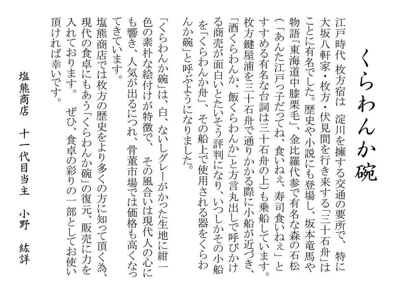 享保年間から続く老舗、塩熊の蔵に所蔵されていた「くらわんか碗」を再現。江戸時代の枚方の面影がよみがえります。贈答にも喜ばれる桐箱入り。