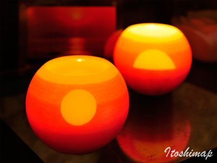 糸島の海岸線に沈む夕日をモチーフにしたランタンキャンドルは、火を灯すと目の前にはまさに糸島の美しい夕日の姿が。
