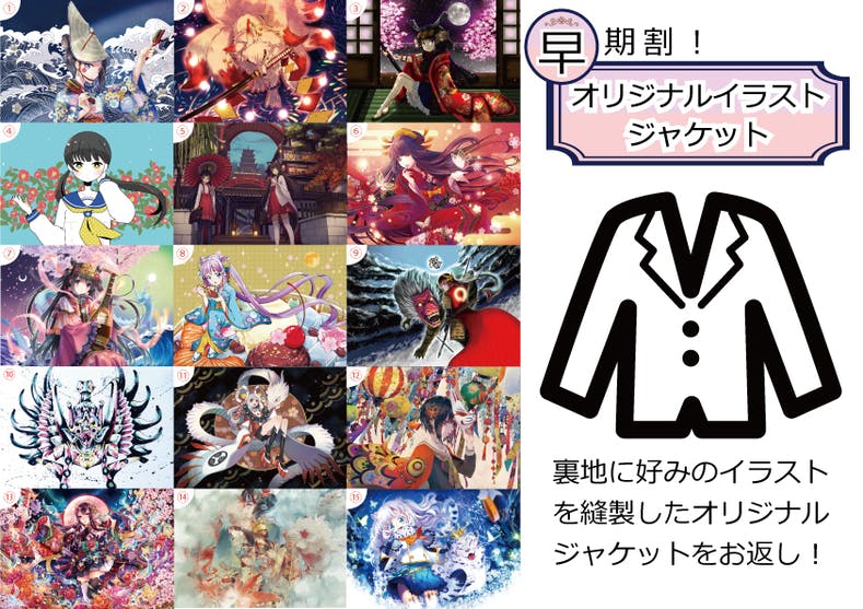 ご支援していただいた額に応じて、各イラスト作家が今回のためだけに描き下ろしたイラストの複製画(A4サイズ)や裏地にそのイラストが印刷されたオリジナルジャケット、その他自分だけのオリジナルジャケットジャケットが創作可能なリターンをご用意しております。