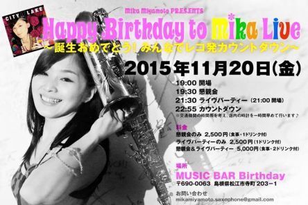 2年ぶりの自主企画による、 レコ発カウントダウンライヴパーティーを開催いたします どなたでもご入場いただけますので、 どうぞお越しくださいね! 『Happy Birthday to Mika Live』 ~誕生おめでとう!みんなでレコ発カウントダウン~ 日時:2015年11月20日(金) 19:00~開場 19:30~懇親会 21:30~ライヴ(21:00開場) 22:55~カウントダウン ※交通機関の時間帯を考え、 店内の時計を1時間早めてカウントダウンを行います 入場料 懇親会のみ・・・2,500円(食事・1dr付) ライヴパーティーのみ・・・2,500円(1dr付) 懇親会&ライヴパーティー・・・5,000円(2dr・食事付) お申し込み・お問い合わせ facebookのメッセージ、又は mikamiyamoto.saxophone@gmail.com までご連絡ください。 ********** 宮本美香