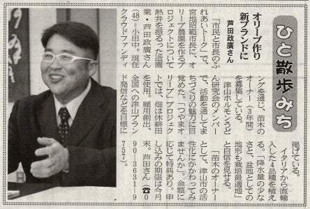 津山朝日新聞に2日連続で、つやまオリーブについての取材が掲載されました。