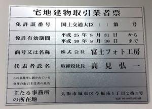 ゼネコン、建築士事務所、不動産業者など事務所内に飾られる許可銘板