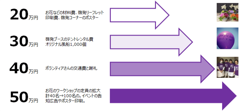 50万円・・・お花のワークショップの定員の拡大 計40名→100名の増員。イベントの告知広告やポスター印刷。