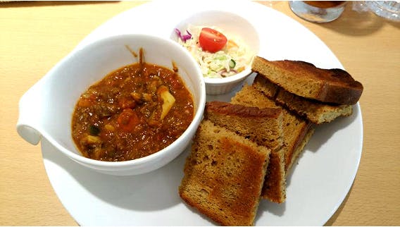 低糖カレー(糖質が少ないのに、しっかりおいしい! 鶏のトマトソース煮に変更可)低糖パン ドリンク ミニパフェ(低糖チーズケーキとラスク入り)