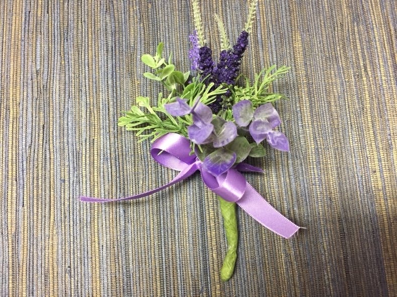 赤紫のジャケットにラベンダーのコサージュつけております。