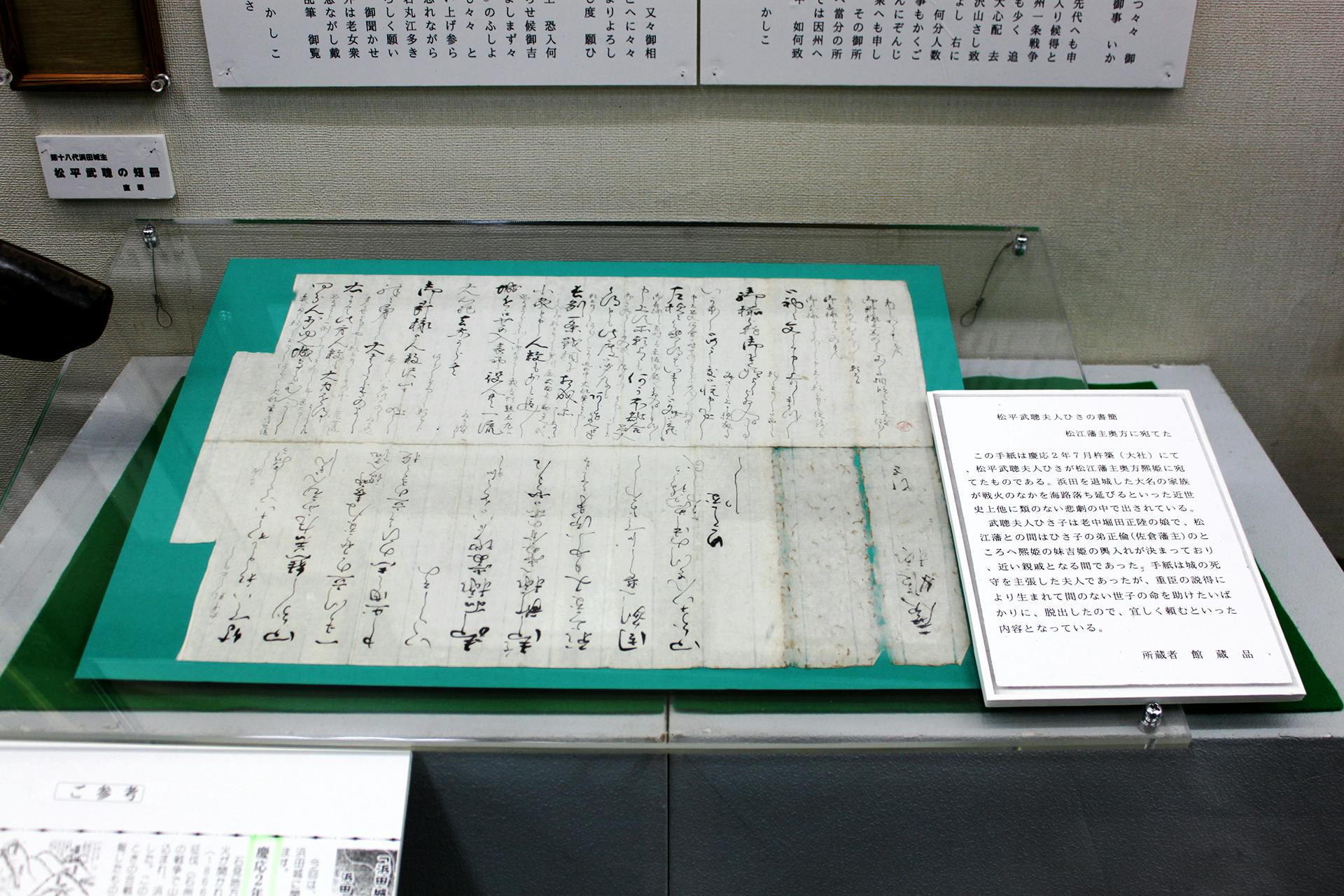 松平武聡夫人ひさが松江藩主奥方熈姫(ひろひめ)に送った手紙です。城の死守を主張した夫人でしたが、重臣の説得により生まれて間もない子どもの命を助けたいばかりに脱出したので宜しく頼むといった内容となっています。