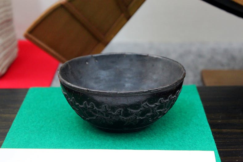 会津屋八右衛門が使用していたお椀です。椰子の実の殻を半分にして薄くくりぬいたものに、花や葉、蔓、鳥、蝶などの柄を彫り出し、その内側に金属の器を張り付けた構造になっています。