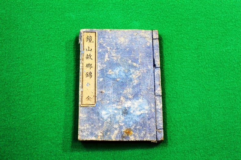 鏡山事件を題材に江戸時代に創作された歌舞伎の演目「鏡山故郷錦(カガミヤマコキョウノニシキエ)」の書籍です。明治15年に改めて印刷されたものです。