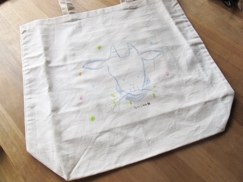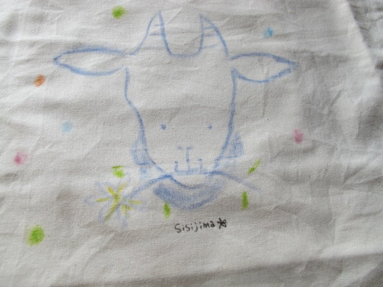 ヤギのイラストのついたエコバッグです。生成りの生地で洗えば洗うほどに味が出てきますよ。すべて手作業で丁寧に仕上げ、一つ一つ手書きの絵を施しています。