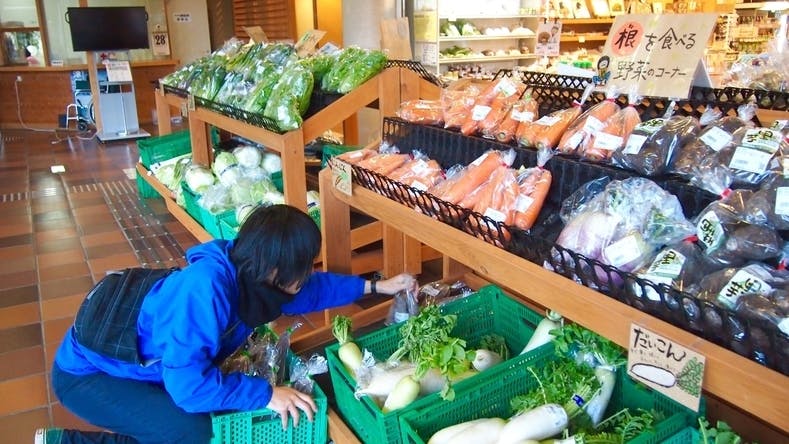道の駅の野菜売り場の陳列を直す。これも三宅さんのお仕事だとか。