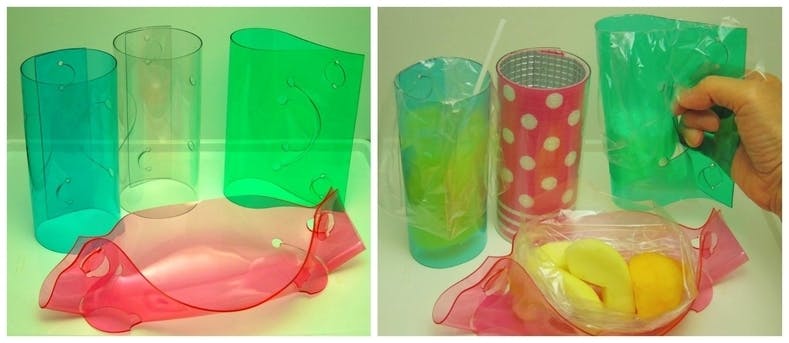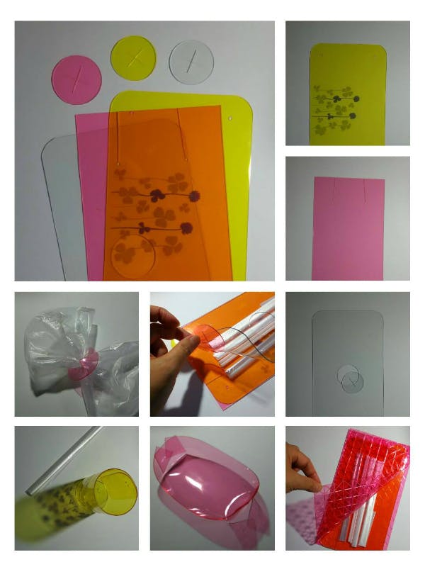どこでも入手でき、安くて安全な食品保存用ポリ袋と、汎用樹脂の中では少し高価で、素材としては入手しにくい美しいカラーのPVCシート。それぞれの足りないところを補った絶妙なコラボです。