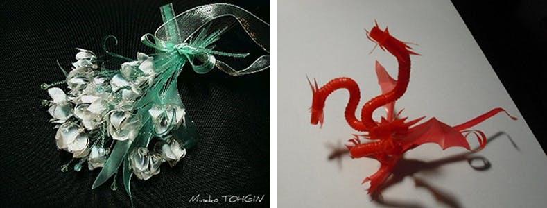 ▲(左)卵パックの花―PET’al-Art(右)ミス・キングギドラ(台湾のストロー)