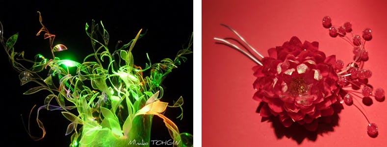 ▲(左)色変わりするPETボトルアート (右)PET’al-Art 成人式のかんざし