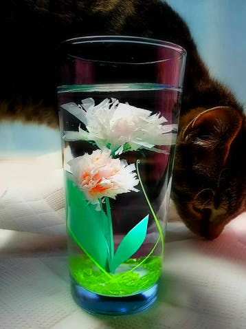 ▲5大汎用樹脂全ての比重を利用した「レジ袋水中花」
