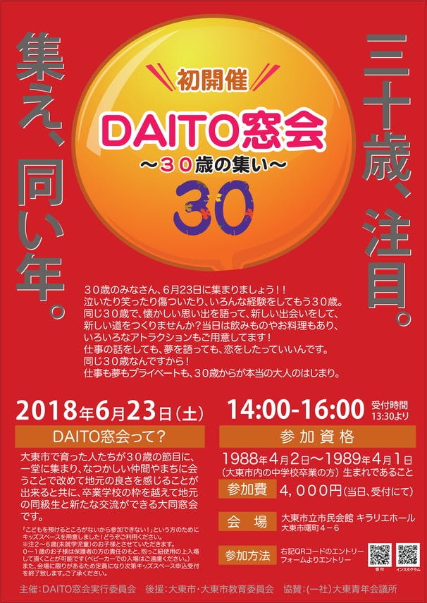私たちはこの度大東市で初めての大同窓会を企画いたしました。仕事やプライベートでも責任が大きくなり始め、新たなライフステージが始まる30代のスタートを切る節目の年に、懐かしい仲間やまちに会う機会をつくることで地域との繋がりを再確認し、より良い30代を過ごせるようにと考えました。現在、大東市内の各中学校代表者によるDAITO窓会実行委員会を立ち上げ準備を進めています。