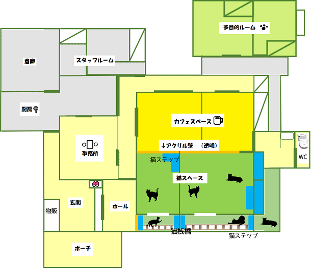 カフェ部分は猫スペースとカフェスペースを透明のアクリル壁で完全に分離しています。