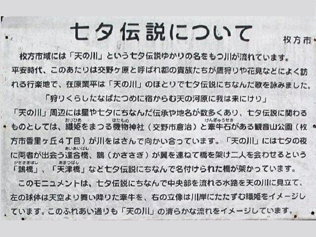 枚方には古くから七夕伝説が存在します。地元に伝わる七夕伝説では『交野市の織物神社に祀られている織姫と、枚方市の観音山公園にある巨石「牽牛石」が、年に1度(7月7日)に天の川(天野川)に架かる逢合橋で出会い、逢瀬を楽しむ』という。