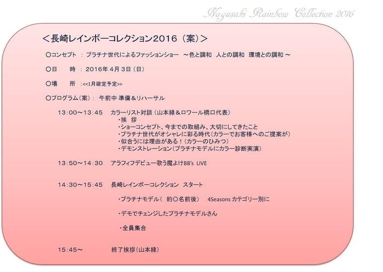 2016/04/04 16:56桜満開の4月3日 長崎レインボーコレクションも大盛況のうちに無事終了いたしました。 皆様のご支援のおかげで開催できたことに心から感謝申し上げます。 モデルさんのイキイキとした表情がスタッフの励みになり、また感動の笑顔がお客様にも伝わり 会場が一体となった気がします、 すでに次回はモデル出演をしてみたい方、スタッフとして関わりたいとおっしゃる方もいらっしゃいました。 嬉しい限りです。 今後もプラチナ世代が光り輝くことのお手伝いができればと思っておりますのでよろしくお願いいたします。 また、本日18:15よりNIB ニュースエブリー で 本番の様子をご覧いただけますので是非よろしくお願いいたします。 本当にありがとうございました。 長崎レインボーコレクション実行委員会代表 山本 緑 もっと見る満員御礼!