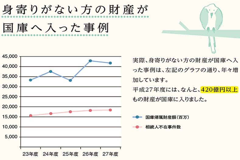 相続財産管理人(※)が現金に換えて、国に入った相続人のいない方の遺産金額は、平成27年度にはなんと420憶円以上!!