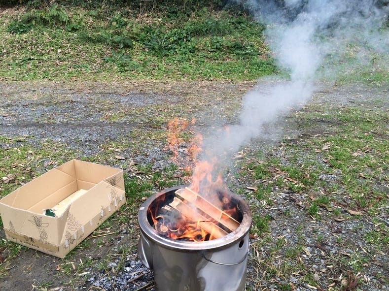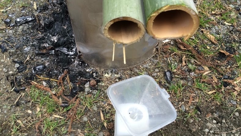 竹を薪代わりにし、焚き火をしその上に節を繰り抜いた竹を乗せて炙ります。