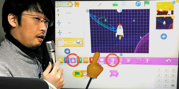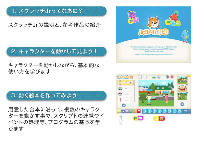 ※スクラッチ JrはMIT(マサチューセッツ工科大学)メディアラボが製作した子供向けコーディング学習ソフト。コードを自分で書くプログラミングではなく、スクリプトブロックをはめ込み、ビジュアル的にプログラムを学んでいきます。