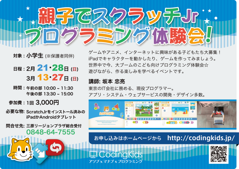 おかげさまで、第1回プログラミング体験会が無事開催されました! iPad持参というハードルの高い中、 2台持ちで参加してくださった強者もいらっしゃいました。 こどもたちの情報教育、テクノロジーの進歩など、 しっかりと未来を見据えた考えを話しながら、 和気藹々と授業、質疑応答を交わしました。 この日は、スクラッチJrの簡単な使い方を学びながら、 「動く絵本」をプログラミングしました。   こども達も、可愛いキャラクターが 《自分で指示したプログラミング》で動いて行く様に、 時に真剣に、時に笑い声や、歓声を上げて楽しく授業をしています。   三原リージョンプラザさんのご好意のもと、 このような機会を作っていけたことに本当に感謝いたします。 イベント後も、映画を上映しているホールで、広報ブースを作っていただきました! 都会との教育格差が深刻な中、 少しでも広島にITの知識を広げていけたらと思います。 ありがとうございました。 つぎのイベント開催は、2月21日、28日を予定しております。 「動く絵本」「ゲーム」をプログラミングできるよう、 カリキュラムを作成していきたいと思います。 もっと見る