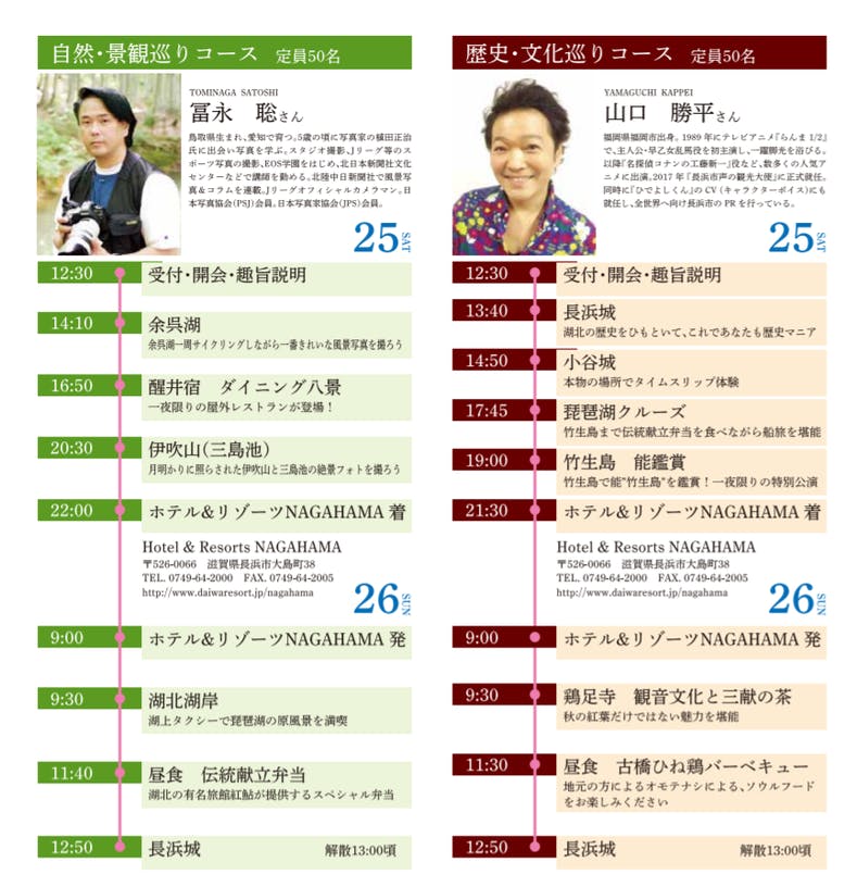 この2日間をより魅力的なプログラムとする為、スペシャルゲストとして、歴史・文化コースでは名探偵コナンやワンピースの人気声優の山口勝平さんを招き、武将に扮して登場させる他、自然・景観コースではキヤノン EOS学園講師 冨永聡さんと湖北八景の絶景フォトを撮るフォトツアーも予定しています。