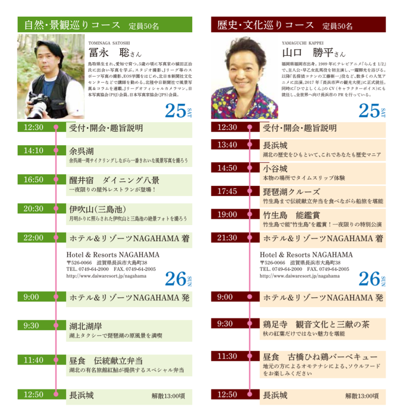 この2日間をより魅力的なプログラムとする為、スペシャルゲストとして、歴史・文化コースでは名探偵コナンやワンピースの人気声優の山口勝平さんを招き、武将に扮して登場させる他、自然・景観コースではキヤノン EOS学園講師 冨永聡さんと湖北八景の絶景フォトを撮るフォトツアーも予定しています。