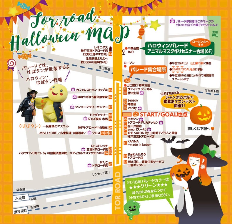 2018/11/07 09:262018/10/27 秋晴れの神戸トアロード 午前9時~、11時~ 中華会館にてクラフトセミナー 応募参加のこどもたち50名と保護者のみなさまホワイトアニマルマスクに思い思いの色を塗ったり 色紙を使って、オリジナルの飾りを創ったり楽しんで制作しました。 午後2時45分 山口銀行神戸支店に集合 午後3時~トアロードを南(山側)から北(海側)へパレードスタート兵庫県のマスコットキャラクター・はばたんもハロウイン仕様マントに身を包み 子供たちと一緒にパレードに参加 組合員店舗の店頭にてスタッフより 「トリックオアトリート」の合言葉でお菓子をもらい笑顔いっぱいの子供たち。 ゴールには、千葉県鴨川市よりやってきたジャンボカボチャ重量当てコンテストも開催しており、101通の応募を頂きました。 近似値の方には、カボチャのお菓子を送らせて頂きました。 ちなみに、正解重量は、191キロでした! このかカボチャは翌日、神戸元町3丁目でのハロウインイベント会場へ引き継がれました。 今回で3回目のこのイベント 来年以降も楽しい企画を考え、みなさまに愛されるトアロードを目指していきたいと思います。 今後とも「トアロード中央商店街」をよろしくお願いいたします。 神戸トアロード中央商店街振興組合 もっと見る【トアロード中央商店街振興組合より、ご報告および御礼】
