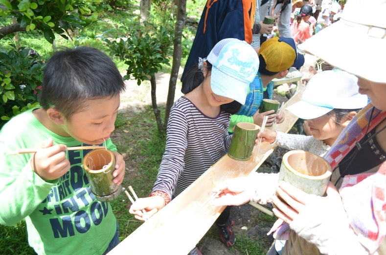 ▽みんなで協力して竹を切り出し、竹器を作って「そうめん流し」を体験!