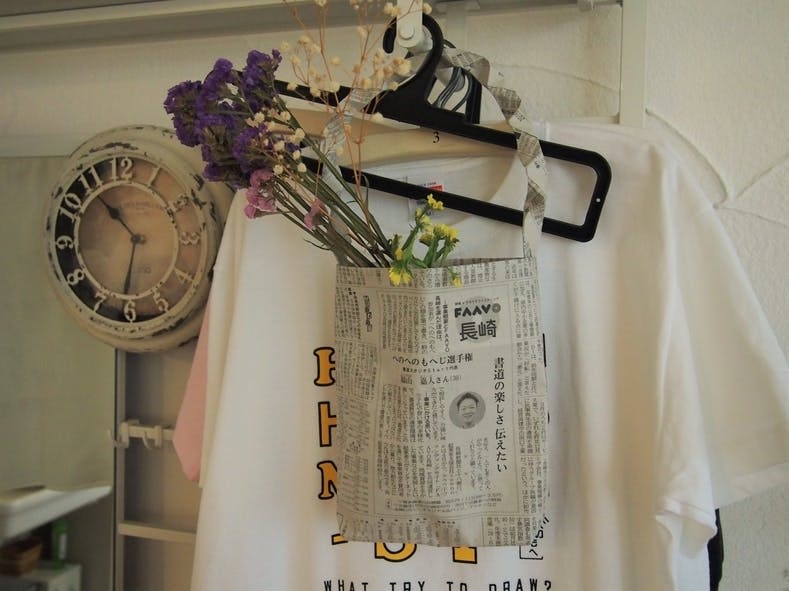 ドライフラワーと一緒に手作りの新聞手提げバッグをいただきました。