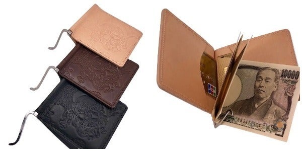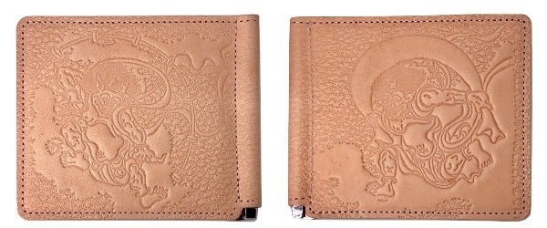 強烈なインパクトで見る者を魅了する、日本人なら誰でも知っている「風神雷神」!国宝にも指定されている琳派の祖、俵屋宗達の「風神雷神図屏風」をモチーフに、国内産牛革にエンボス加工(浮き出し凹凸型押し)を施したマネークリップを製作しました。
