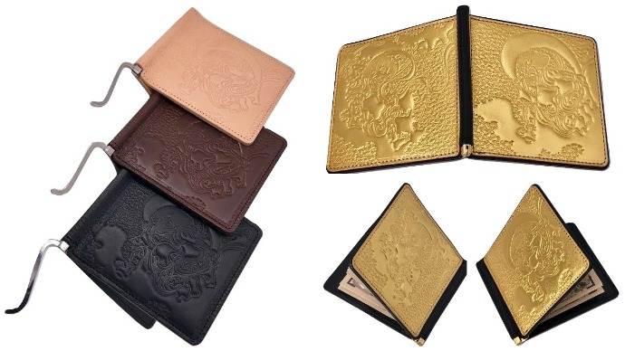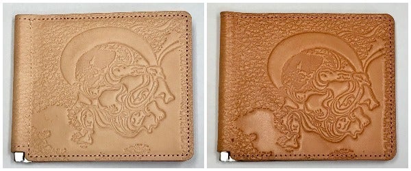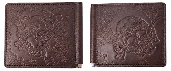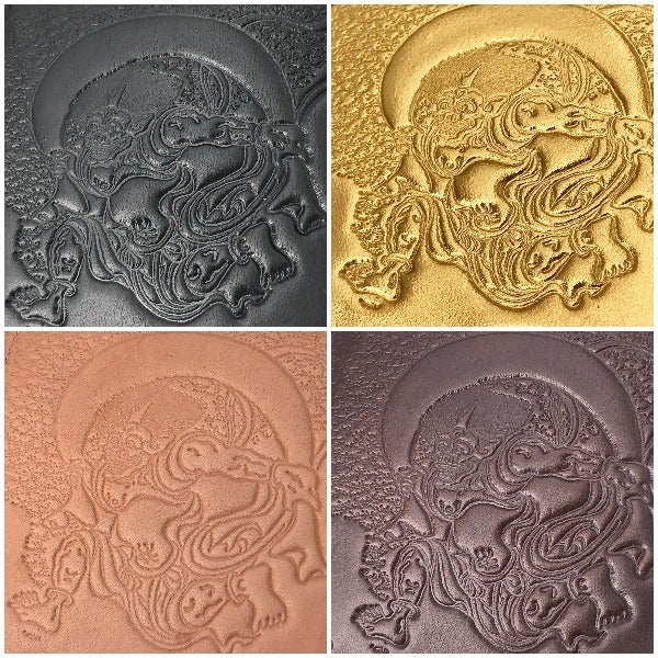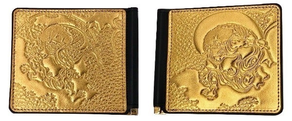 「本物」は金箔を全面に貼り、無限空間の奥行を表現しているそうですが、本マネークリップは、エンボス加工(一般的な型押しではなく、凹凸のある立体的な型押し)で風神雷神の躍動感を表現してみました。