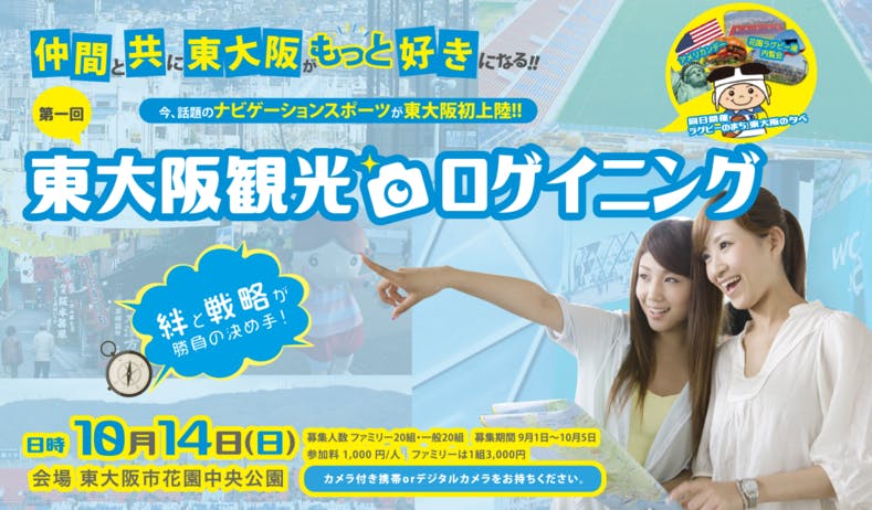 我々は来る10月14日(日)、花園中央公園にてロゲイニングイベントを開催することが決まりました!もちろん東大阪では初開催、その名も「東大阪観光×ロゲイニング」!この日は東大阪市主催の「らぐびーのまち東大阪の夕べ」も開催され、盛り上がりを見せることが予想され、日程としてもベストと考えております。