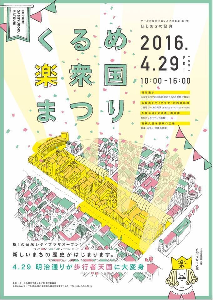 これを記念して、直後の祝日となる29日に久留米シティプラザのオープンを市民が祝う「くるめ楽衆国まつり」 を開催することになり、久留米のメインストリート明治通りが歩行者天国になります。