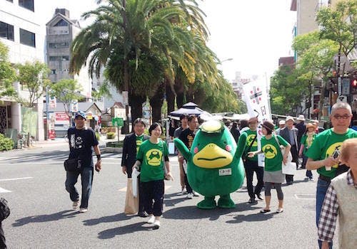 時には家族と、時には仲間と、そして去年はくるめ日曜市の出店者さんや応援してくださる仲間やボランティアの方々と。高知の日曜市にはスタッフや出店者で何度も視察しています。昨年は久留米のゆるキャラ「くるっぱ」も一緒でした。