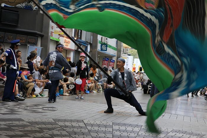 また上町のフラフ(大旗)も有名ですが、実際に5月の節句で鯉のぼりと同じように立てかけられます。そのフラフを豪快に振りますのでお楽しみに。踊り子たちは小学4年生から中学3年生で構成しており、今年は各会場に「福」を届けよう!ということでテーマを福を届ける「福娘」とさせていただいております。上町の可愛い踊りでくるめ楽衆国まつりのイベントを盛り上げますのでどうぞ宜しくお願いします。