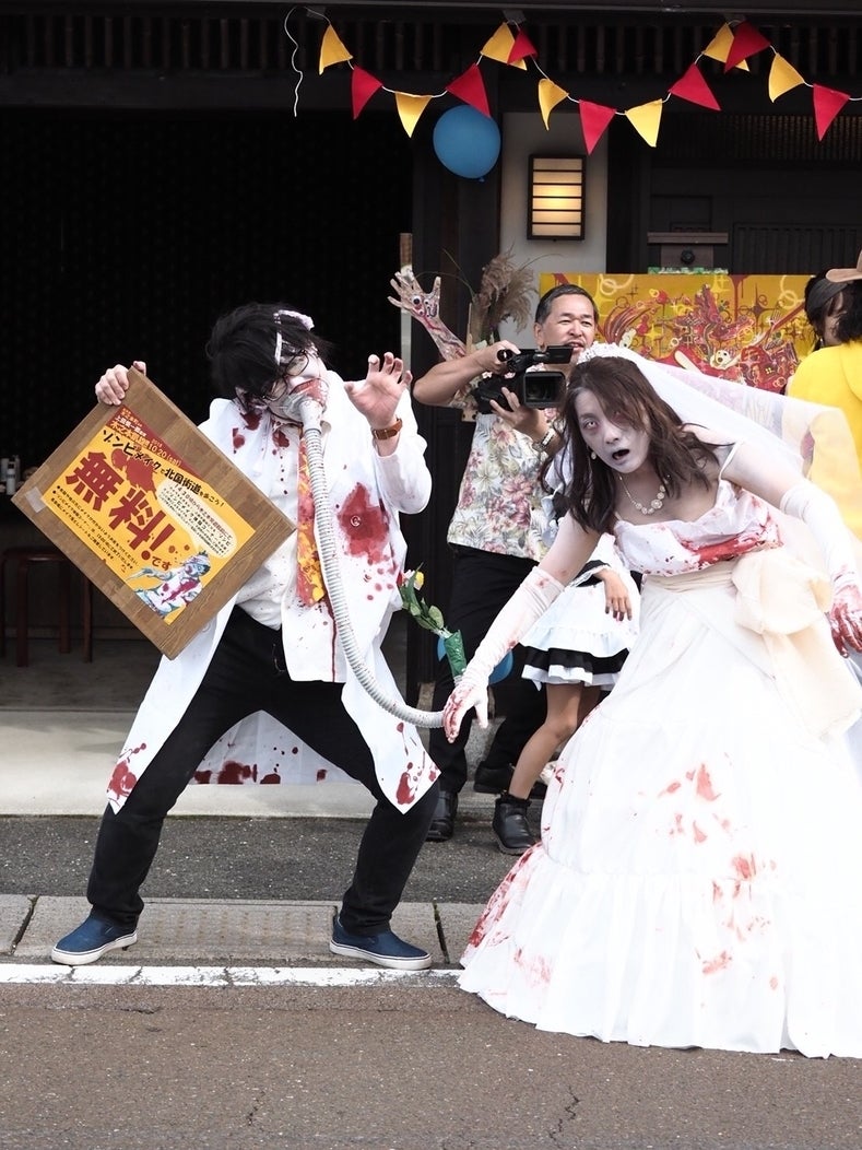 →濱津さん、しゅはまさん、キノモトゾンビの皆様、ありがとうございました。最初本当は「ONE CUT OF THE DEAD」の様にワンカットでいこうと言っていましたが、木之本の商店街の人たちがほとんどの中、そんな簡単に行くわけなく、結局100カット近く撮影して夕方5時に終了。その後一晩で監督が編集。お疲れ様でした^^