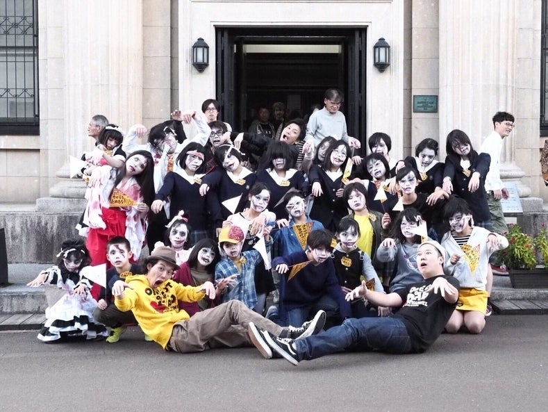 →上田監督、鈴木君と一緒に交遊館から日吉座まで、子供と学生ゾンビ、そして講演会ご来場の方々でゾンビウォーク。