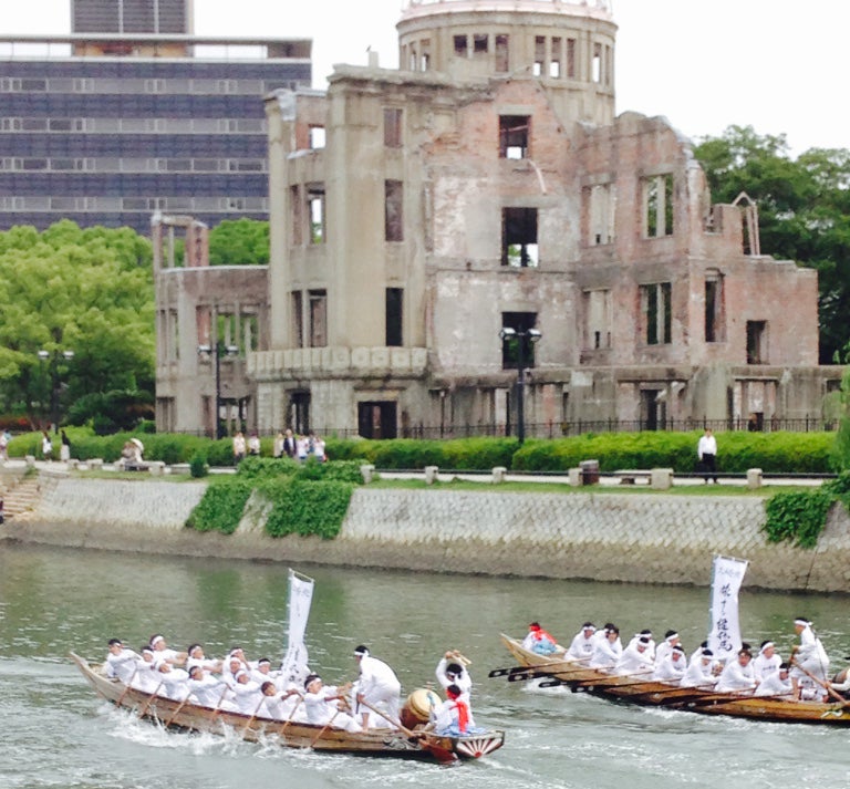ルートとしては、島の伝統ある和船『櫂伝馬』で大崎上島から宮島まで、途中、原爆ドームに立ち寄るために、本安川を上り、相生橋のT字をUターン。本川を下り広島市に大きな『輪=和』を描いて、広島が誇る2つの世界遺産、原爆ドームと宮島をつなぎます。